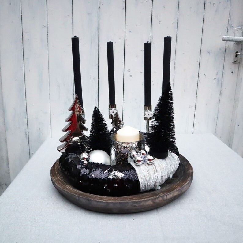 In den "Pailettenkranz" habe ich hochwertige, stabile Stabkerzenhalter eingesetzt. Dekoriert wurde das Ganze mit modernen Tannenbäumen in schwarz, Keramiktannenbäumen in silberfarbig hochglänzend, großen Glaskugeln, eine edlen Glaswindlicht und silberfarbigen Perlen.