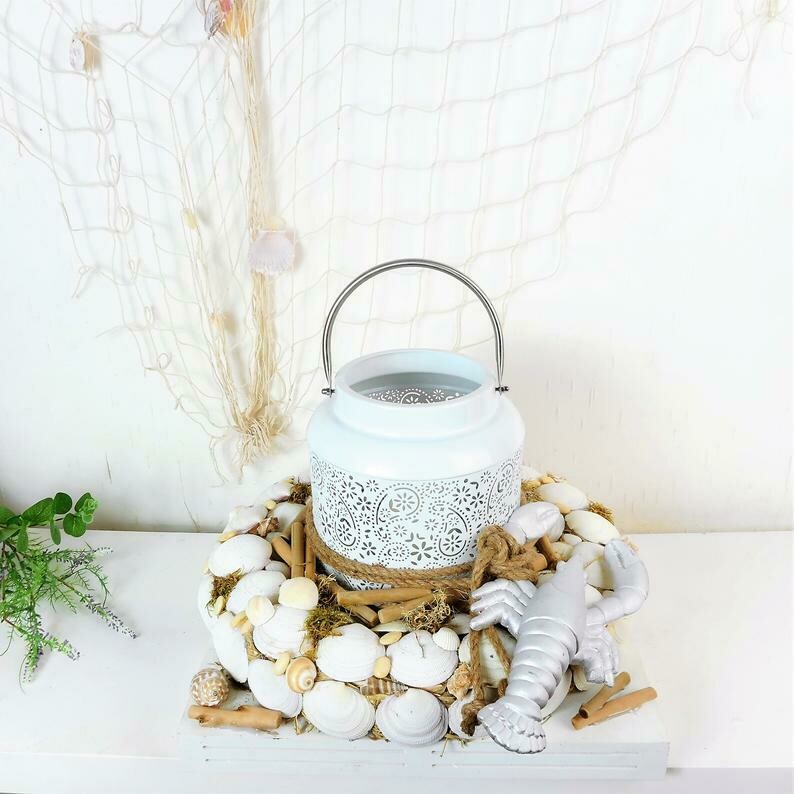 Tischwindlicht in Natur - und Weißtönen, gefertigt aus einem Kranz, über und über mit Muscheln dekoriert, mit einem Metallwindlicht in der Mitte, mit Tauen und Naturdekorationen verziert. Vorne rechts wurde ein großer silberfarbiger Hummer aufgesetzt.