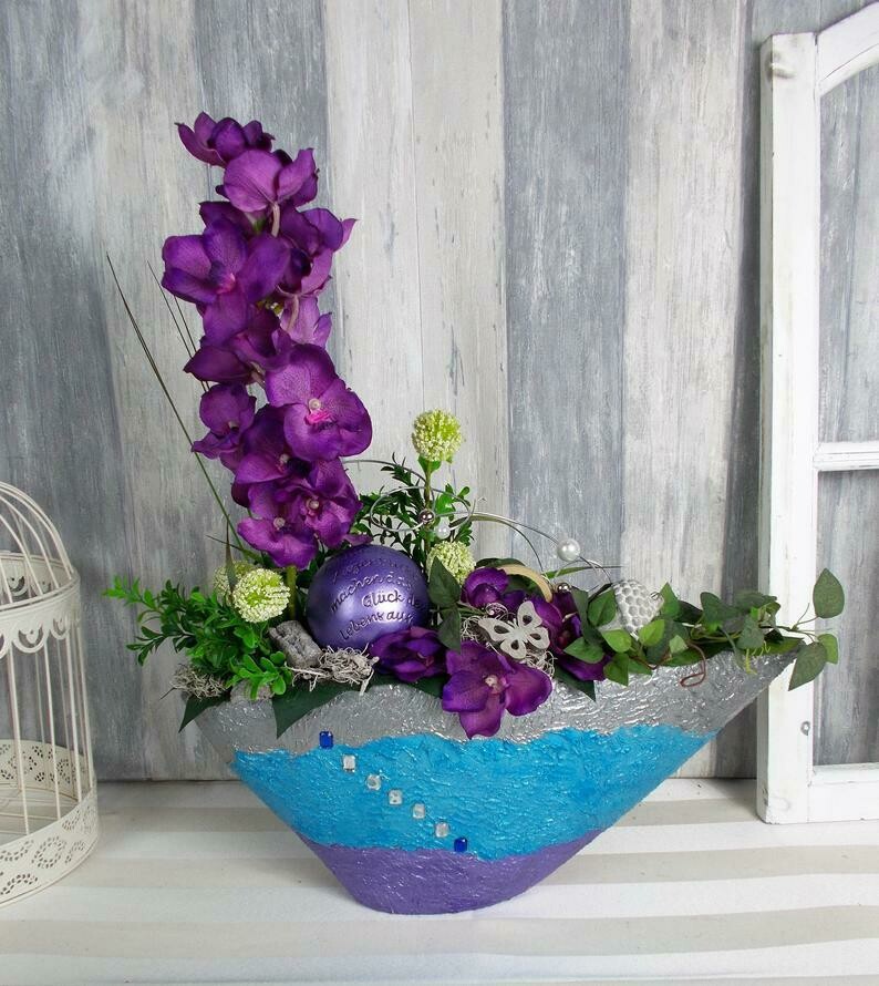 Außergewöhnliches Gesteck in Keramikschale die blau, silber und lila farbig gestaltet wurde. Dekoriert mit einer großen Orchideen-Rispe.