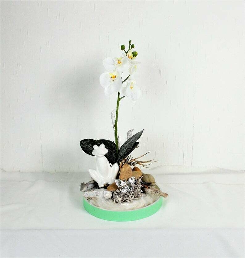 Tischdeko mit Orchidee und modernem Frosch, Sommerdeko, Tischgesteck